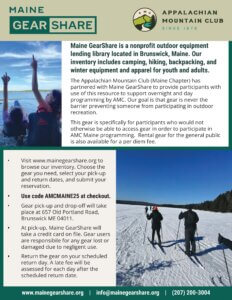 The AMC Maine Chapter is committed to making outdoor adventure accessible to all. If you are interested in participating but the cost of proper outdoor gear is a barrier, please click here for information about our partnership with Maine GearShare. High quality rental gear is available at no cost to you, if you would not otherwise be able to participate in AMC programming.